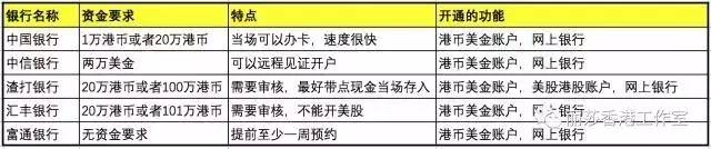 中國銀行,中信銀行,渣打銀行,匯豐銀行,富邦銀行(沒有資金要求,只限內部預約)。其中中信銀行可以在國內指定分行可以見證開戶,富通銀行對資金沒有要求,但是只限內部提前預約,具體區(qū)別整體如下: