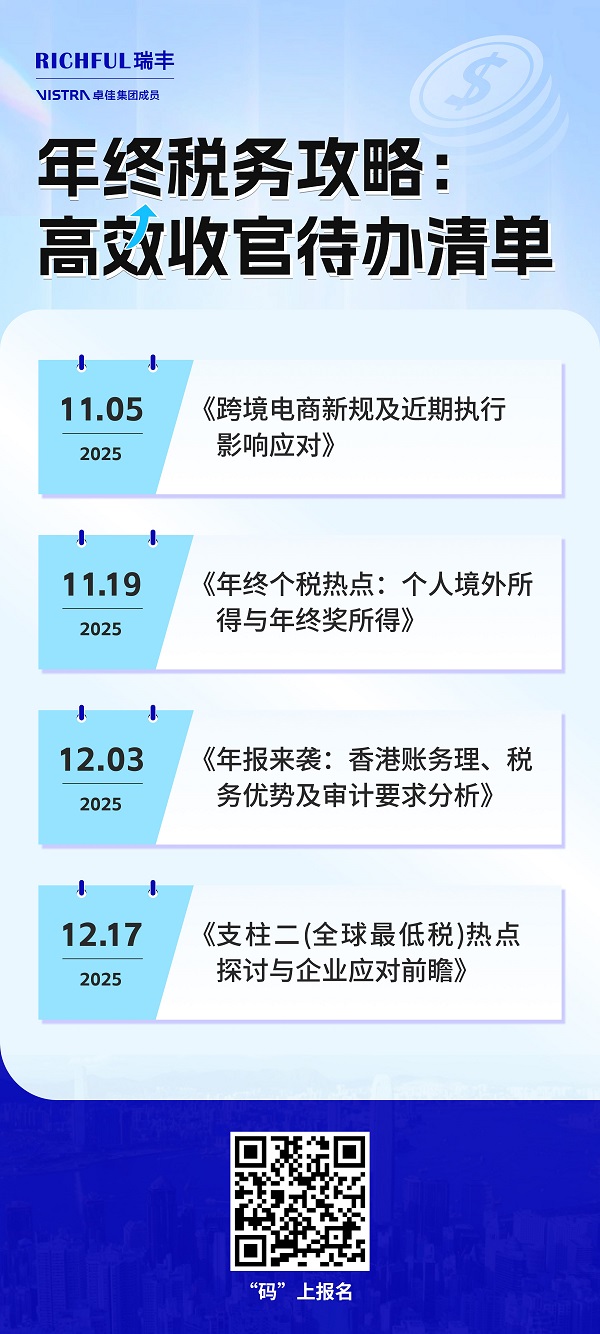 歲末將至,面對紛繁復雜的稅務政策與緊迫的年度收官工作,您是否正在尋求一份清晰高效的行動指南?我們精心策劃 “年終稅務攻略:高效收官待辦清單”系列網(wǎng)絡研討會,直擊四大關鍵議題,助您系統(tǒng)梳理合規(guī)路徑,優(yōu)化財稅布局,為2025年的穩(wěn)健發(fā)展奠定堅實基礎。