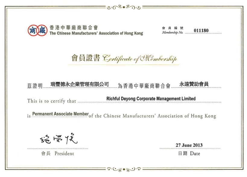 香港中華廠商聯(lián)合會(huì)頒發(fā)會(huì)員證書