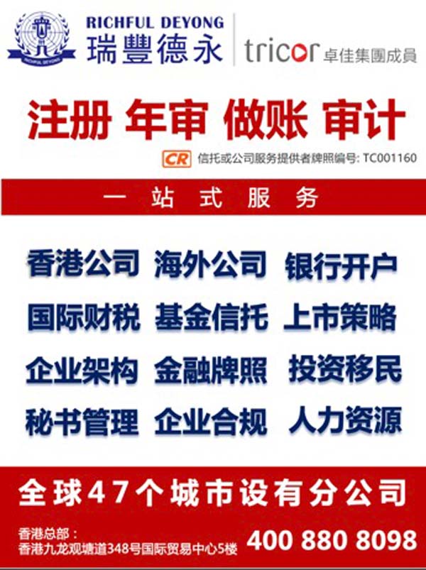 服務(wù)涵蓋:上市公司秘書(shū)、新股上市及股票登記、債務(wù)托管及授信,財(cái)富管理,海外信托和基金會(huì)設(shè)立,香港及離岸公司注冊(cè),特許牌照申請(qǐng),企業(yè)架構(gòu),財(cái)稅咨詢(xún),會(huì)計(jì)安排,人力資源、薪酬管理,綜合性商務(wù)、企業(yè)及投資者服務(wù)等領(lǐng)域。瑞豐德永秉持“全球化運(yùn)營(yíng),國(guó)際化標(biāo)準(zhǔn),致力于每一位客戶(hù)的滿(mǎn)意和成功”的服務(wù)宗旨,務(wù)實(shí)為中國(guó)企業(yè)國(guó)際化發(fā)展拓展價(jià)值版圖,是您值得信賴(lài)的合作伙伴!