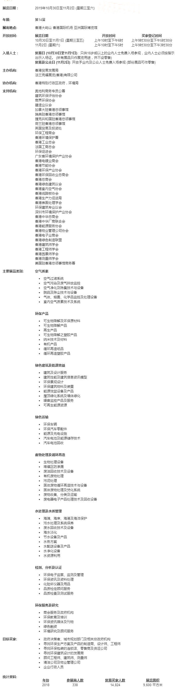 國(guó)際環(huán)保博覽是亞洲環(huán)保行業(yè)的優(yōu)質(zhì)商貿(mào)平臺(tái),展示最新的環(huán)保產(chǎn)品、設(shè)備和先進(jìn)技術(shù)。博覽由香港特區(qū)政府環(huán)境局協(xié)辦,通過(guò)香港、中國(guó)內(nèi)地及國(guó)際政府部門和行業(yè)商會(huì)的鼎力支持,為環(huán)保行業(yè)提供企業(yè)對(duì)政府(B2G)和企業(yè)對(duì)企業(yè)(B2B)層面的商機(jī)。
