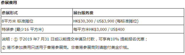 參展商于2019年 7月 31日或之前遞交報名表格及參展費用