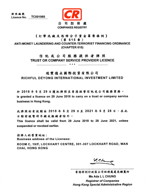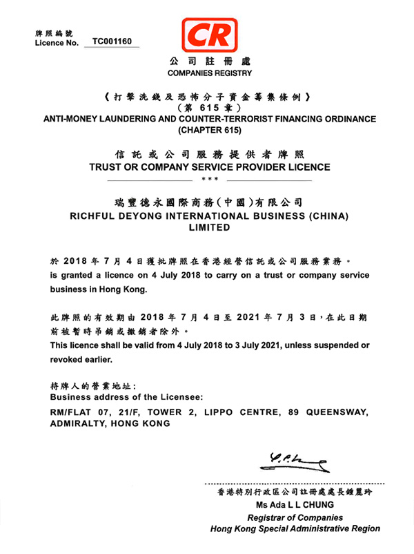瑞豐德永 【信托或公司服務(wù)提供者牌照】 三張牌照 香港公司注冊處查冊: