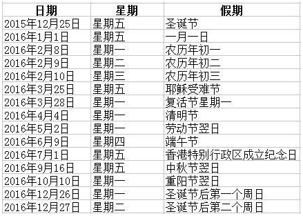 據(jù)香港交易所網(wǎng)站顯示,除周末雙休外,2016年香港股市中因節(jié)假日全天休市14天,且全年無半日市。
