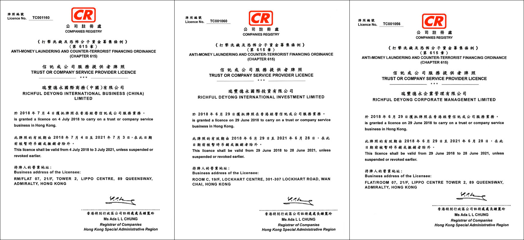 信托或公司服務提供者牌照:TC001160、TC001060、TC001056