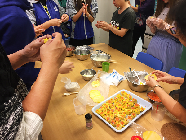 瑞豐義工團都馬上動手,聽從導師指示分工,先包燒賣和臘腸卷。