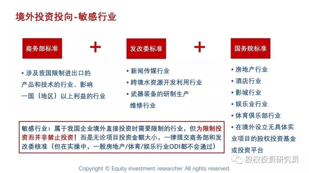 1.敏感行業(yè):屬于我國企業(yè)境外直接投資時(shí)需要限制的行業(yè),但為限制投資而并非禁止投資!而是無論項(xiàng)目投資金額大小,一律提交商務(wù)部和發(fā)改委核準(zhǔn)(但在實(shí)操中,一般房地產(chǎn)/體育/娛樂行業(yè)ODI都不會(huì)通過)