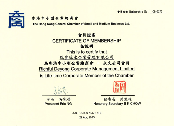 香港中小型企業(yè)總商會頒發(fā)會員證書