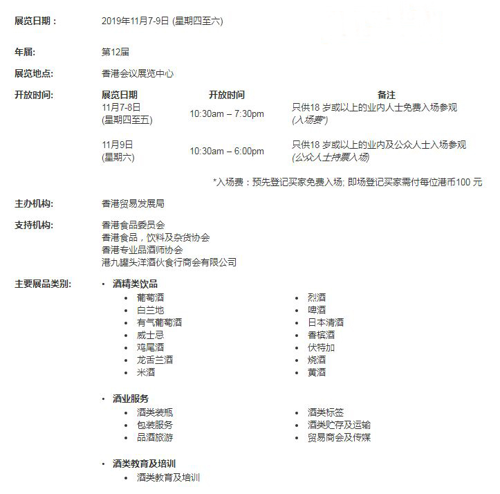 由香港貿(mào)易發(fā)展局主辦的第十二屆香港國際美酒展(美酒展)于2019年載譽重來,再度展出各種各樣香醇佳釀,為業(yè)界締造超乎所想的發(fā)展機遇。這項備受矚目的盛會已成為不可多得的美酒交易和采購平臺,展覽為期三天,將假灣仔香港會議展覽中心舉行,匯聚來自世界各地優(yōu)質(zhì)葡萄酒和烈酒業(yè)界有影響力的買家、專家和品酒大師。美酒展于2018年吸引來自73個國家及地區(qū),近1萬9千名買家入場參觀,進一步鞏固香港作為葡萄酒貿(mào)易中心的領先地位,同時確保一千多家優(yōu)質(zhì)國際參展商取得豐碩成果,開拓商機。