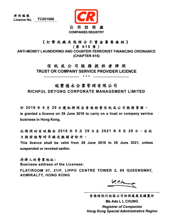 瑞豐德永 【信托或公司服務(wù)提供者牌照】 三張牌照 香港公司注冊處查冊: