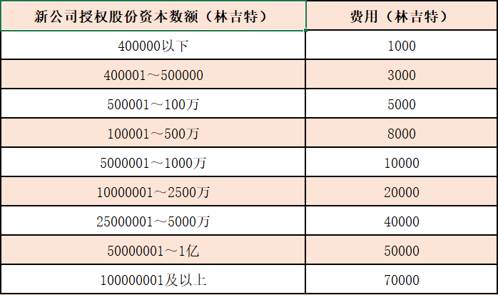 公司設立的費用將根據新公司擬授權的不同股份資本數(shù)量按照下述表格而收取固定費用: