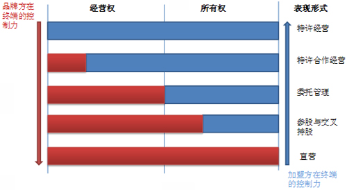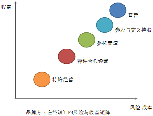 在這張圖里,我們大致可以看出品牌公司在對(duì)終端五種不同的方式控制路徑下,他們的風(fēng)險(xiǎn)-成本與收益的組合。連鎖公司經(jīng)營的初期往往會(huì)注重終端的數(shù)量而非質(zhì)量,所以會(huì)選擇較小的收益與較低的風(fēng)險(xiǎn)-成本,當(dāng)終端“圈地”完成之后,重點(diǎn)則轉(zhuǎn)入單店的贏利能力和單店帶給公司的營業(yè)收入。我們說沒有一種愛情是最好的,不同的階段可能會(huì)欣賞不同的戀愛方式,品牌公司也是如此,最重要的還是要根據(jù)自己自身資源與能力,在公司戰(zhàn)略的指引下選擇一種或是幾種的連鎖組合。